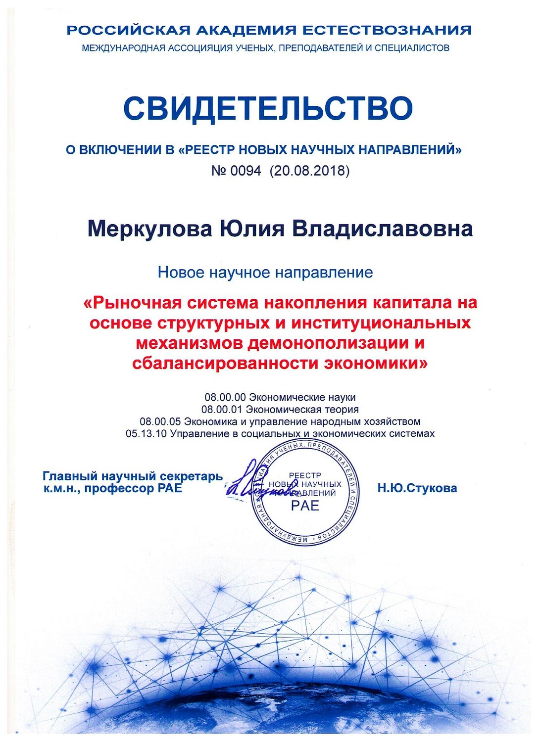 Свидетельство № 0094 от 20.08.2018 о включении в Реестр новых научных направлений направления: "Рыночная система накопления капиала на основе структурных и институциональных механизмов демонополизации и сбалансированности экономики"