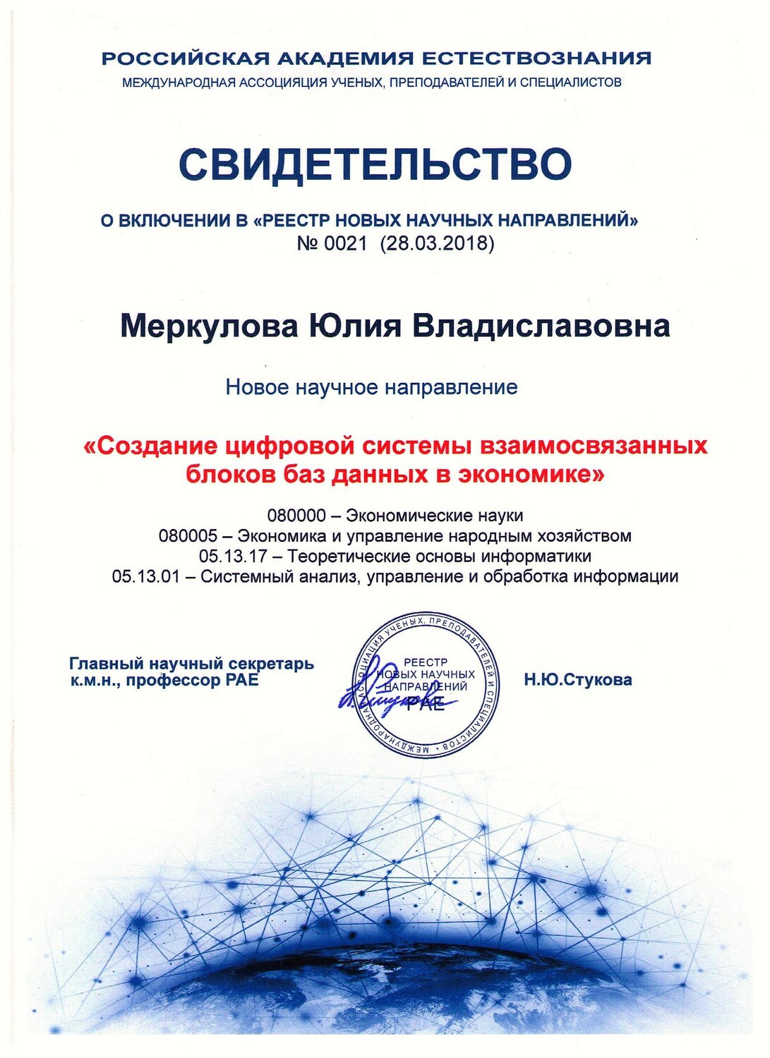 Свидетельство № 0021 от 28.03.2018 о включении в Реестр новых научных направлений направления: "Создание цифровой системы взаимосвязанных блоков баз данных в экономике"