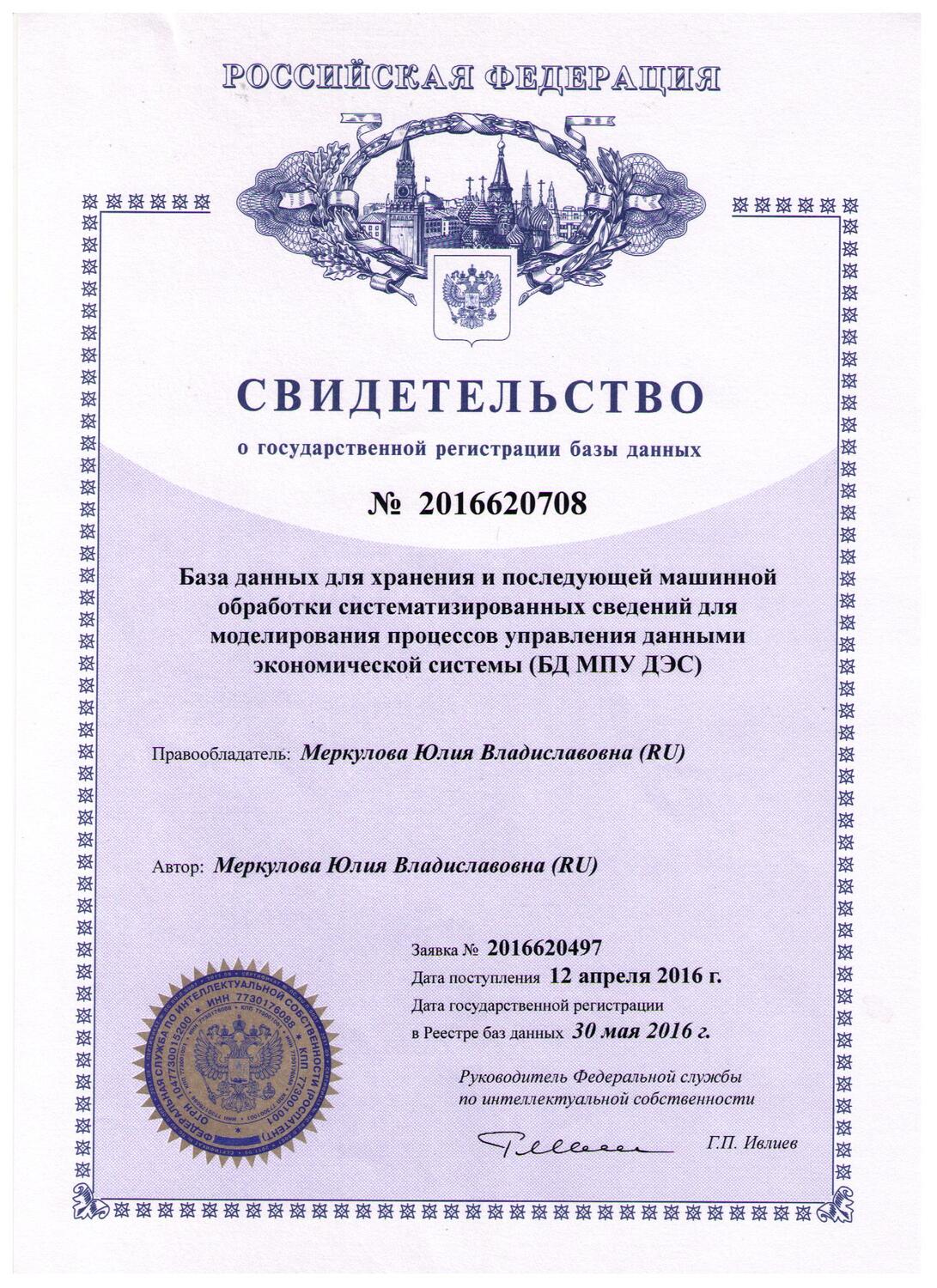о государственной регистрации в Реестре баз данных Базы данных для хранения и последующей машинной обработки систематизированных сведений для моделирования процессов управления данными экономической системы (БД МПУ ДЭС)