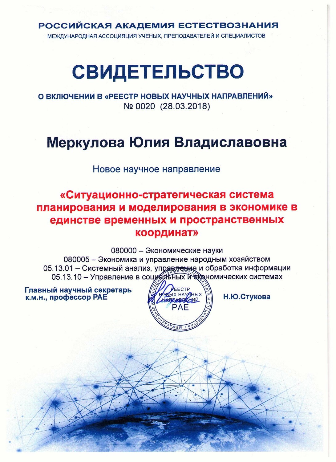 Свидетельство № 0020 от 28.03.2018 о включении в Реестр новых научных направлений научного направления: "Ситуационно-стратегическая система планирования и моделирования в экономике в единстве временных и пространственных координат"