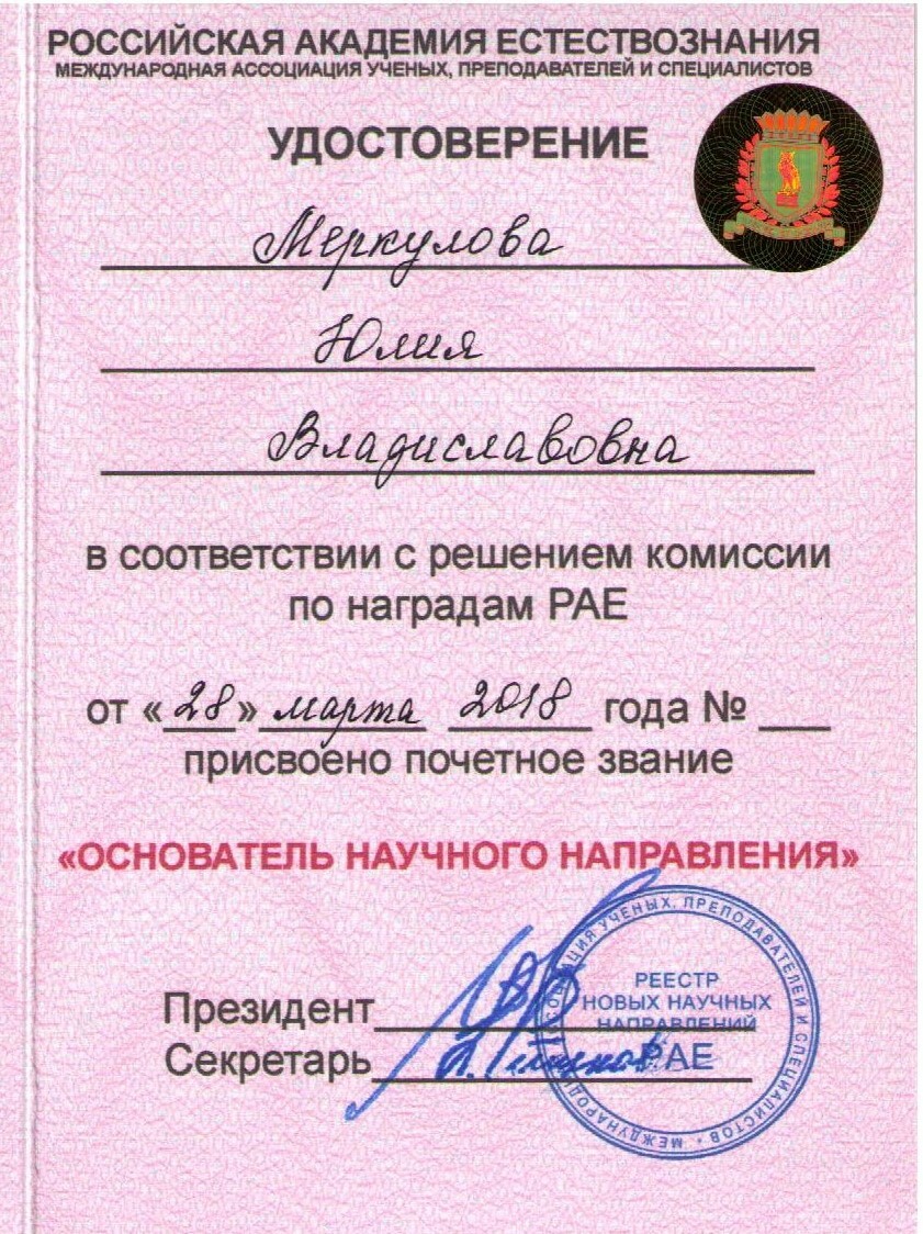 Меркулова Ю.В. создала новую научную школу, потому что она создала и зарегистрировала четыре новых научных направления, которые включены в "Реестр новых научных направлений", а именно следующие: