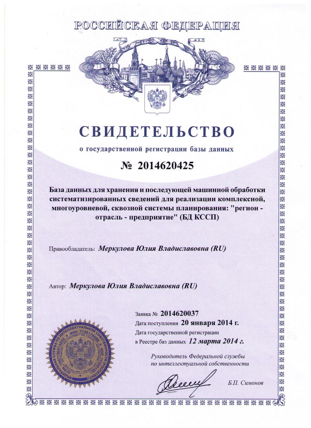 о государственной регистрации в Реестре баз данных Базы данных для хранения и последующей машинной обработки систематизированных сведений для еализации комплексной, многоуровневой, сквозной системы планирования: "регион -отрасль - предприятие" (БД КССП)