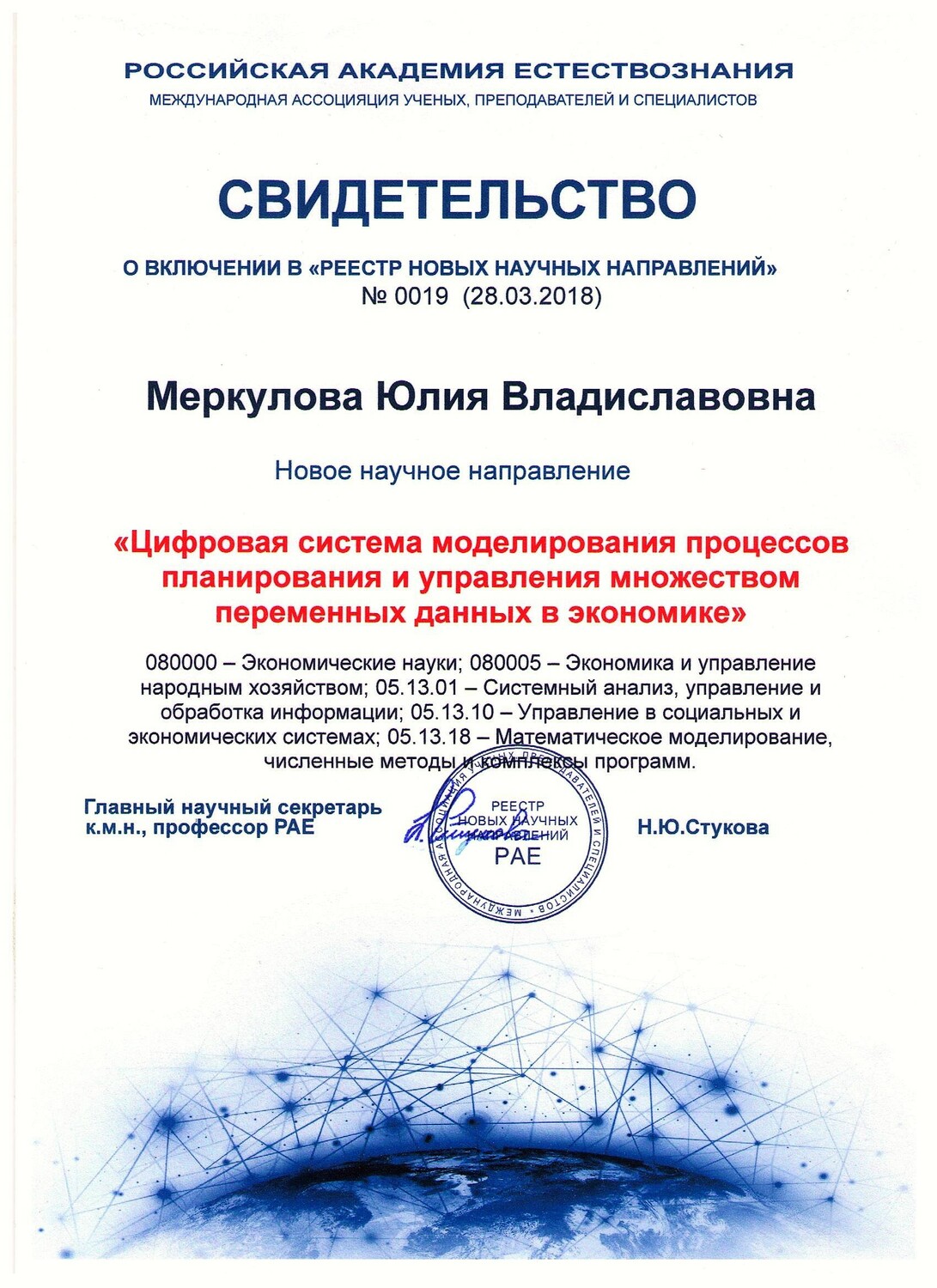 Свидетельство № 0019 от 28.03.2018 о включении в Реестр новых научных направлений направления: "Цифровая система моделирования процессов планирования и управления множеством переменных данных в экономике"