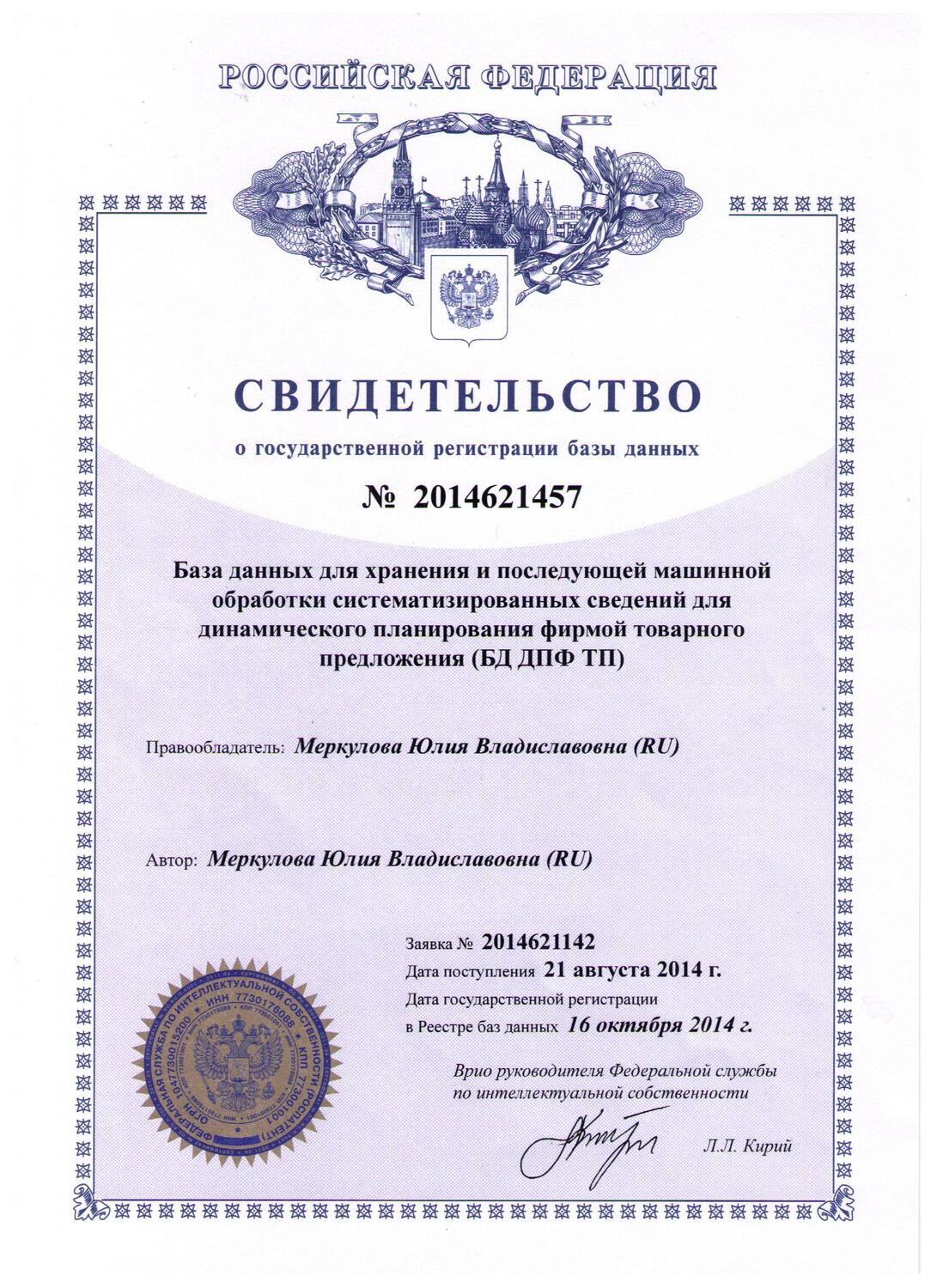 о государственной регистрации в Реестре баз данных Базы данных для хранения и последующей машинной обработки систематизированных сведений для динамического планирования фирмой товарного предложения (БД ДПФ ТП)