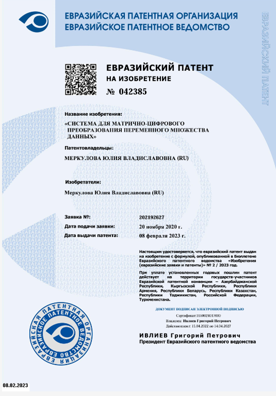 Меркулова Ю.В. - автор идеи и разработчик теории преобразования больших данных в экономике, так как она является изобретателем в этой области, а именно единственным изобретателем и патентообладателем российского патента №2752911 "Система осуществления способа матрично-цифрового преобразования переменного множества данных для генерации ситуационно-стратегической продуктовой программы", о чём имеется запись в Государственном реестре изобретений от 11.08.2021, а также Евразийского патента № 042385 на изобретение: "Система для матрично-цифрового преобразования переменного множества данных".